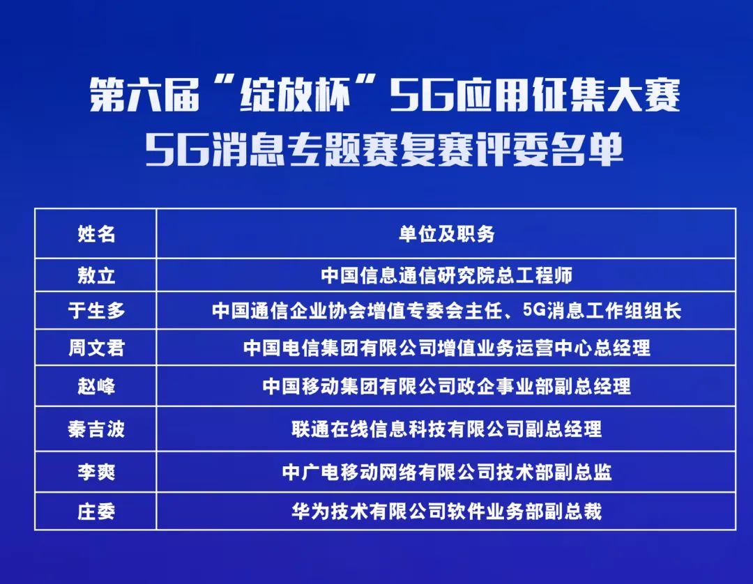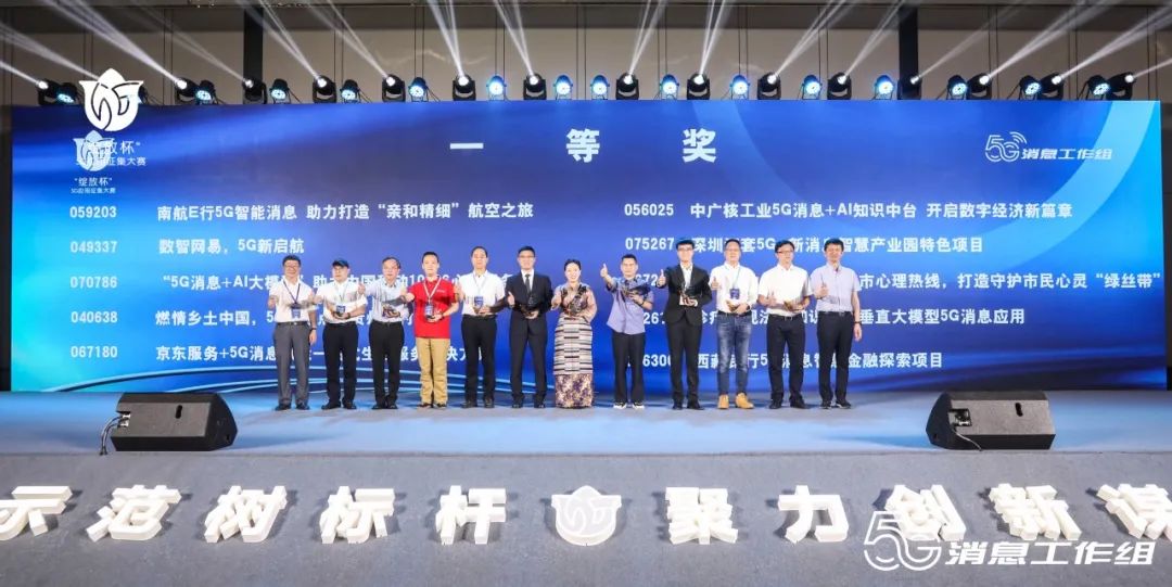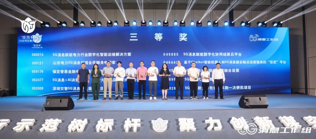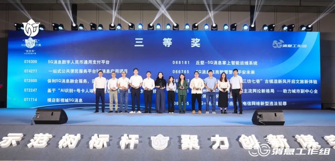 经过激烈的角逐,最终遴选出一等奖和二等奖。决赛结束后举行了颁奖仪式,工业和信息化部信息通信发展司三级调研员梁屾,中国信息通信研究院总工程师敖立、中国通信企业协会增值专委会主任、5G消息工作组组长于生多在颁奖仪式环节致辞并为获奖选手颁奖。中国通信企业协会增值专委会秘书长、5G消息工作组副组长李旦担任颁奖仪式主持人。