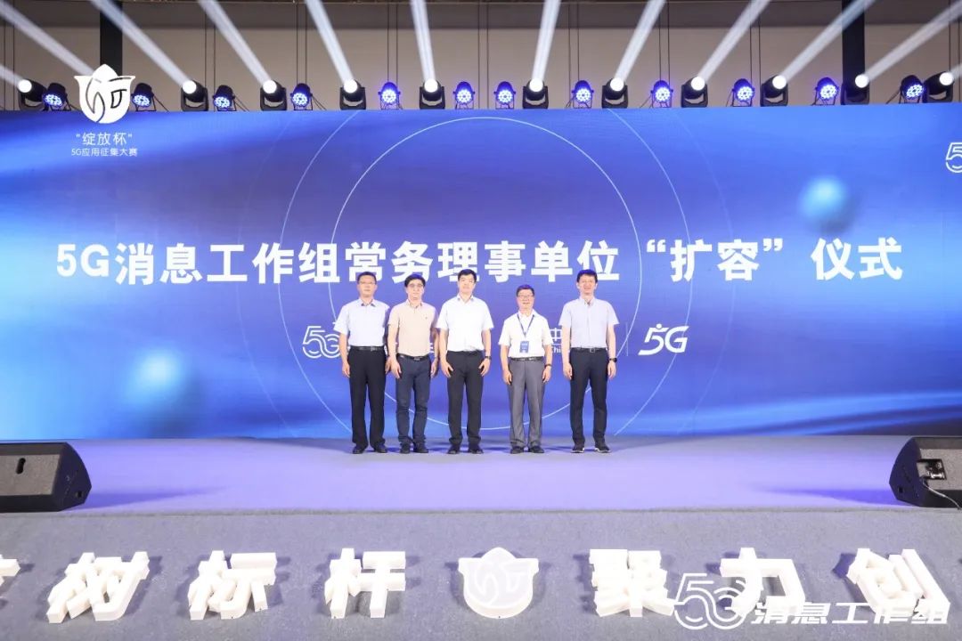 接下来,5G消息工作组开启了“扩容”仪式,中广电移动网络有限公司正式作为常务理事单位加入5G消息工作组,工业和信息化部信息通信发展司三级调研员梁屾,中国信息通信研究院总工程师敖立,中国通信企业协会增值专委会主任、5G消息工作组组长于生多,中国信息通信研究院泰尔终端实验室副主任果敢和中广电移动网络有限公司技术部副总监李爽上台见证扩容仪式。