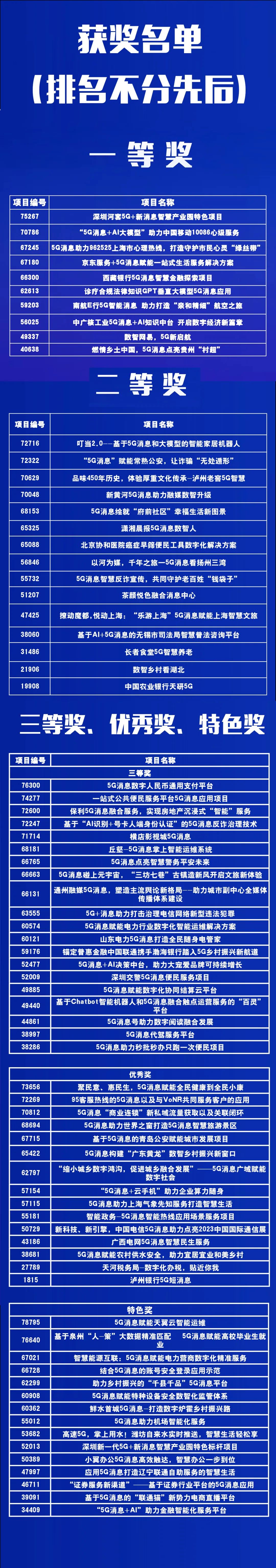 本次专题赛赛自6月底启动以来,共征集到来自全国各地的598个项目参赛,经项目查重和资格复审,共征集有效项目497个。通过初赛、复赛、决赛的层层选拔,最终评选出一等奖10项、二等奖15项、三等奖20项、优秀奖15项、特色奖15项,展示了5G消息应用赋能数字化发展的重大潜力。